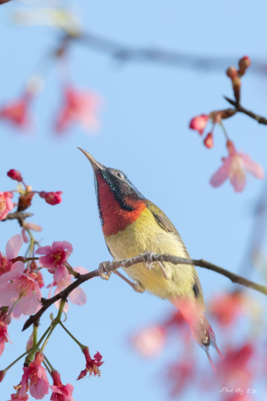 樱红缀枝 翠鸟衔春(摄影作品)